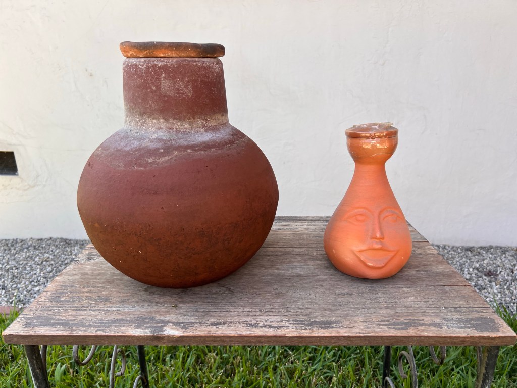 Olla pots come in different sizes and makers. I use Dripping Springs Ollas due to their wide neck and the excellent craftsmanship and feel of the clay. This particular brand is made in Mexico with clay from Mexico and imported to a company in Dripping Springs, Texas, for distribution. They make two sizes of Olla pots: one large that is for watering about 3-4 feet diameter area and the other small, with a decorative face, for 20″ diameter. Their pots also come with matching lids.