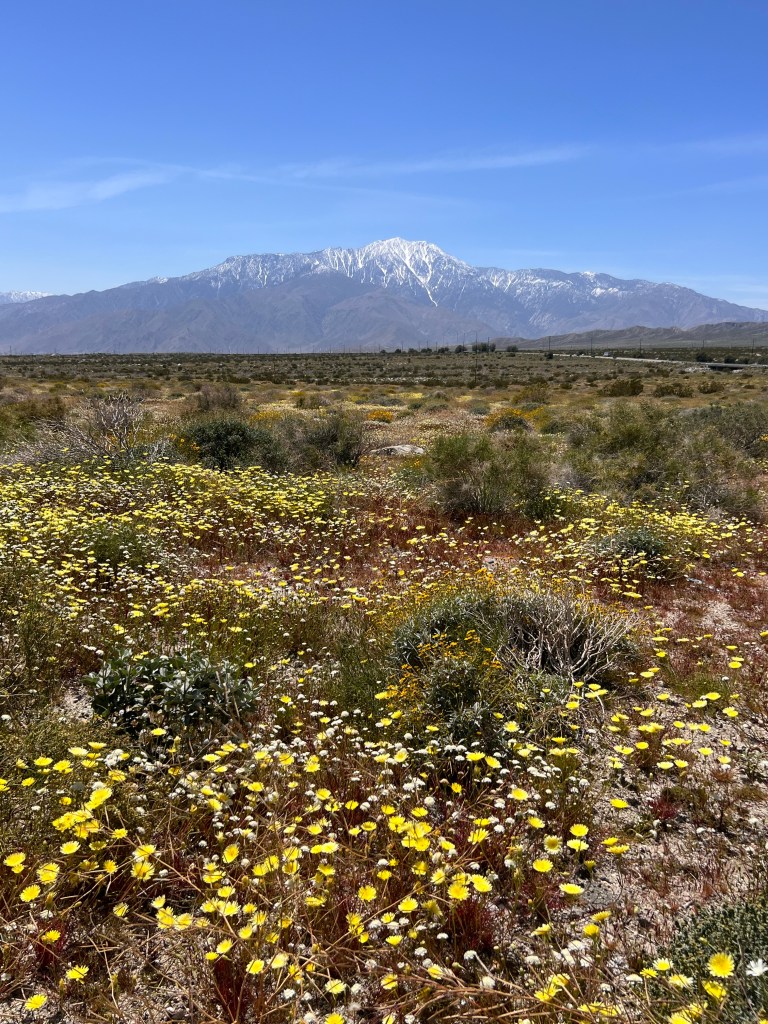 We headed to the desert on April 7, to Desert Hot Springs. We drove on the scenic route highway 62 and turned right on Indian Canyon Drive and captured the mountain and desert bloom view. There have been previous blooms when we drove past this area in years past and never stopped as we were in a hurry to get to Joshua Tree National Park. This time, armed with knowledge, we hiked at Mission Creek Reserve.