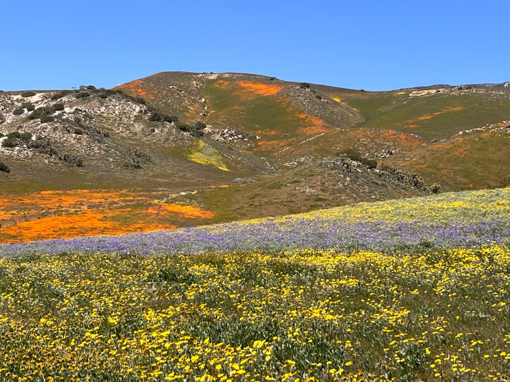 We were given permission and the opportunity to hike up a hill and visit the same spot from behind. Fields of California poppies appeared in one area and then disappeared, replaced with fields of goldfields. When we reached the top, the entire area became desert-like and it was like a line was drawn where the poppies would stop and the Mojave Desert would begin. Seeing this in person was such a fascinating lesson in our landscapes and deserts. As if experiencing all these blooms throughout California wasn’t impressive enough, this location was a true wonderment of our rich diverse habitats.