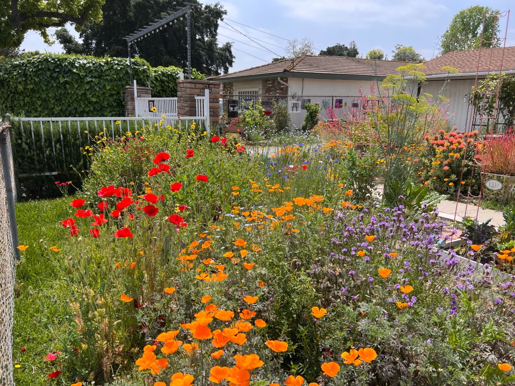 I have had this current garden incarnation for seven years. My small backyard garden moved to the side of our house, where the grass was dying from years of drought, and I gained three times the amount of space. Wanting to make things more ornamental as it is visible from the street and to also attract pollinators, I planted some native plants including brittle brush, penstemon, orange mallow, Indian mallow, and electric blue sage. Many of those survived, a few did not.