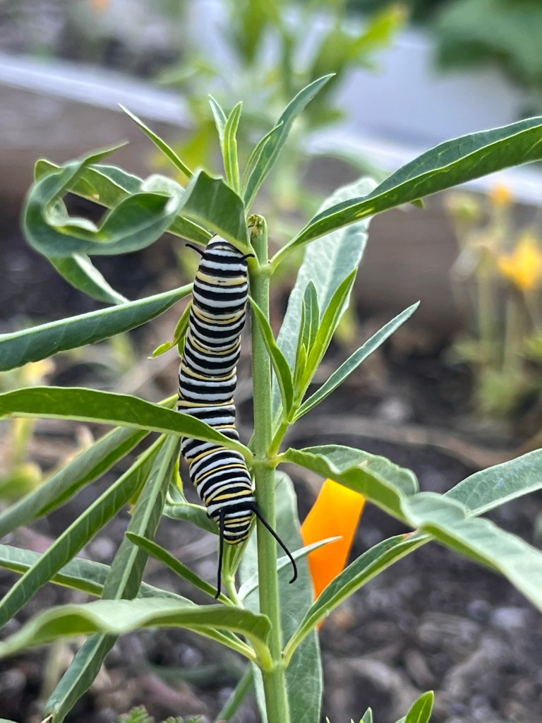 This year, a narrow-leaf milkweed finally grew consistently. Just when the plant seemed to be growing larger, I saw parts of it being nibbled alway. It was delightful to see large fat striped monarch caterpillar twisting its body and eating away. Unfortunately, the weather turned very warm rather quickly and I’m not sure if they were able to survive the heat.