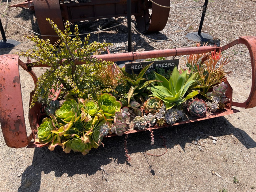 The final section of the garden is part seating area and extra space to store several larger farm equipment. To make the area more interesting, heat tolerant succulents were planted in this area and a farm equipment is used as a unique planter.
