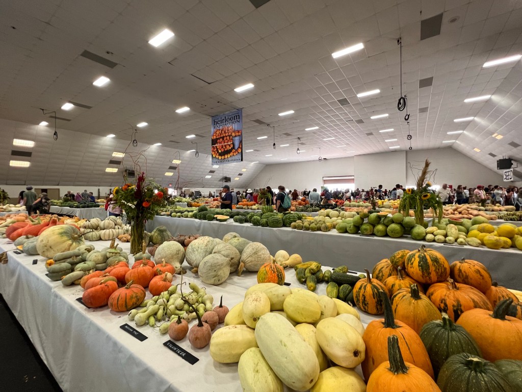 I wasn’t quite sure what to expect from the Heirloom Expo and visited their website. The Heirloom Expo is a celebration of heirloom seeds and the diversity of seeds and foods. Most heirloom seed growers tend to be organic growers and utilize some theories of permaculture, a holistic way of gardening. The events included vendors, speakers, exhibits, and an heirloom poultry show, giant pumpkins, and a seed swap. The backdrop to all of this is their famous gigantic squash pile that is filled with many different types of squash in all shapes and sizes and stacked “sky high.”