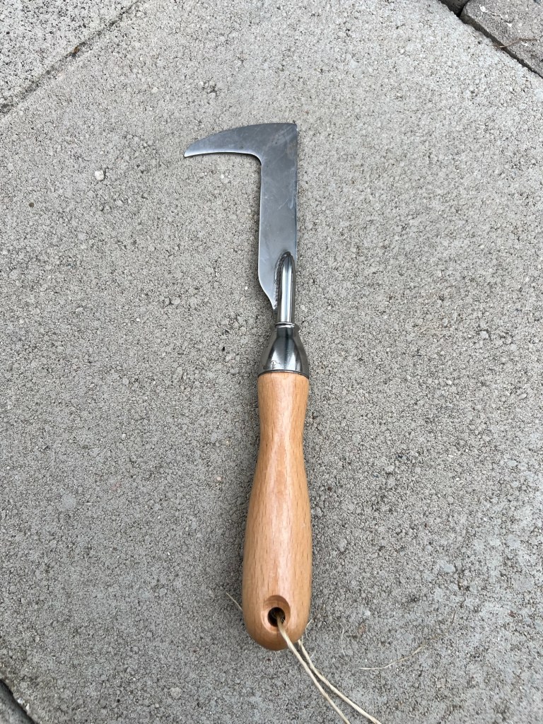 This is quite an extraordinary tool. It is used much like a hoe where you scrape the top of the soil but unlike a hoe where you dig and loosen the soil, this one gently cuts and pulls the weeds on top. Digging is minimal, you can direct the sharp point to dig at the more stubborn roots.