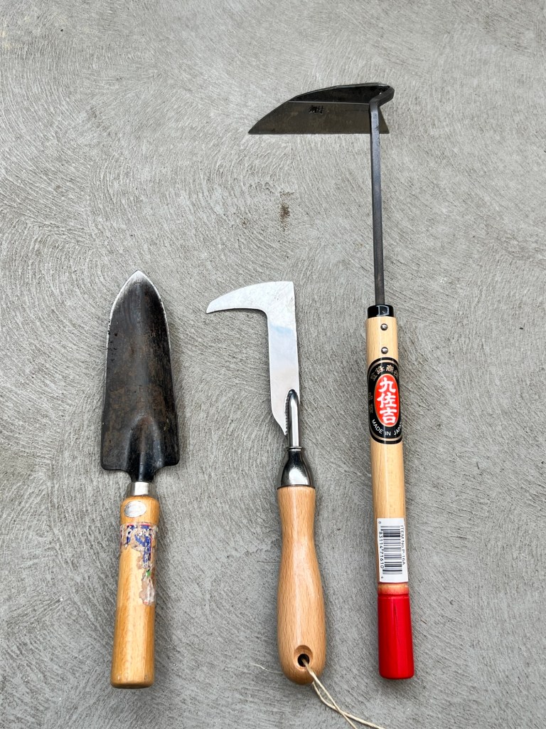 While shopping at Hida Tools, I recommend the lightweight and sharp “Bonsai Garden Trowel (Narrow Blade)” ($14). I find this to be a better precision tool when digging around my clay soil and especially digging out weeds. Because of the lightness, you will tire less when you have a big weed job.