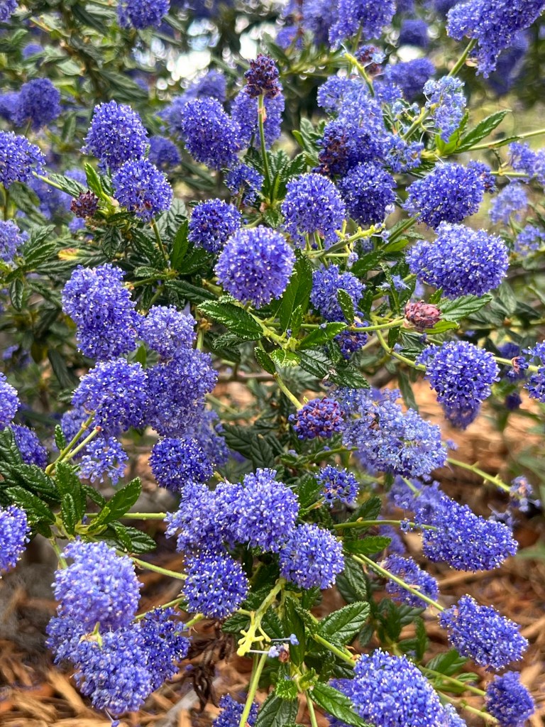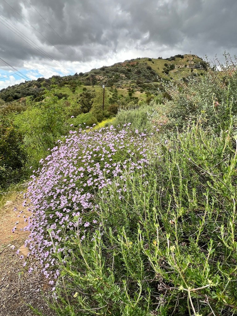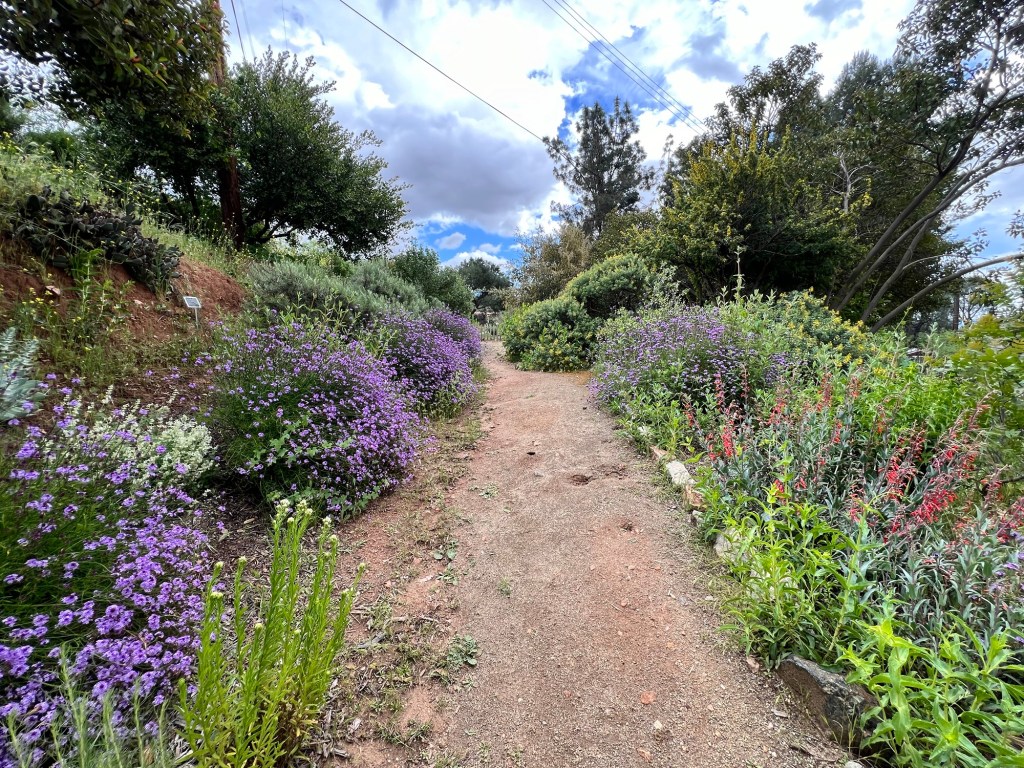 Wildflower Hill is a gradually steep hill that sits adjacent to the plant nursery. On my visit in the first week of April 2024, Wildflower Hill had a lovely bloom of a variety of shrubs and annuals. The lower half of the hill has a welcoming sight of purple sage, Cedros sage, and the everlasting blooms of De La Mina verbena shrubs along the dirt trail. The walk leads you higher to blooms of blue dicks, chia, brittle brush, cactus, sunflowers, and penstemons.