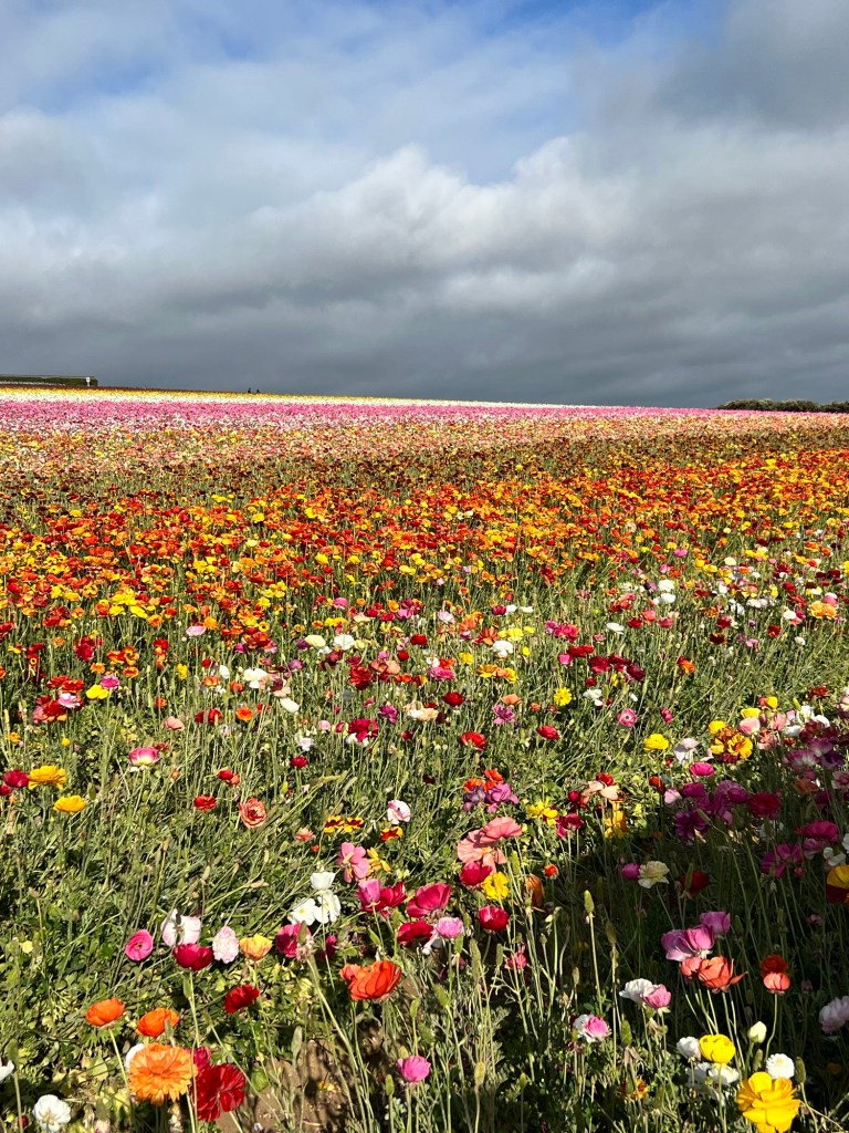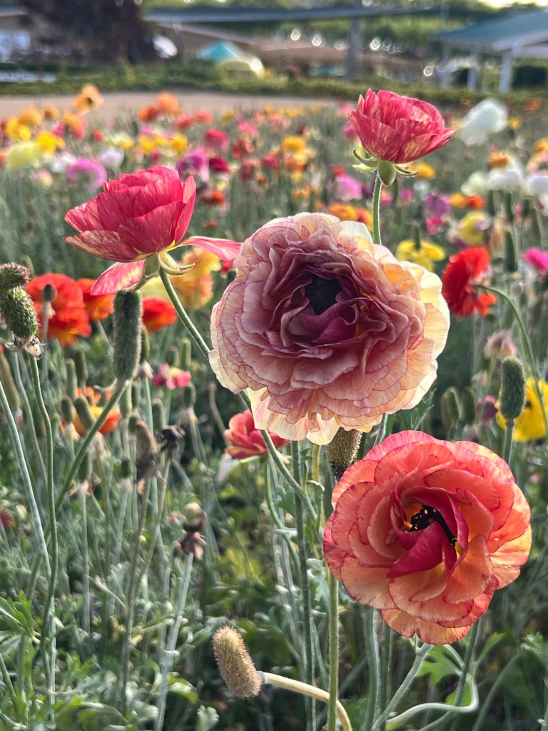- Closer to peak bloom then at the beginning of the season. The farm plants the ranaculous in sections with the earliest bloomers at the left of the entrance and you will see gradual blooms from left to right during the entire flower season. If you go midway through the season, you will see the entire fields in ribbons of color stretching from end to end. For some, these long streaks of color is the reason for going. For me, however, my eyes and head can only handle so much so I’m fairly satisfied with seeing the final two sections in bloom.