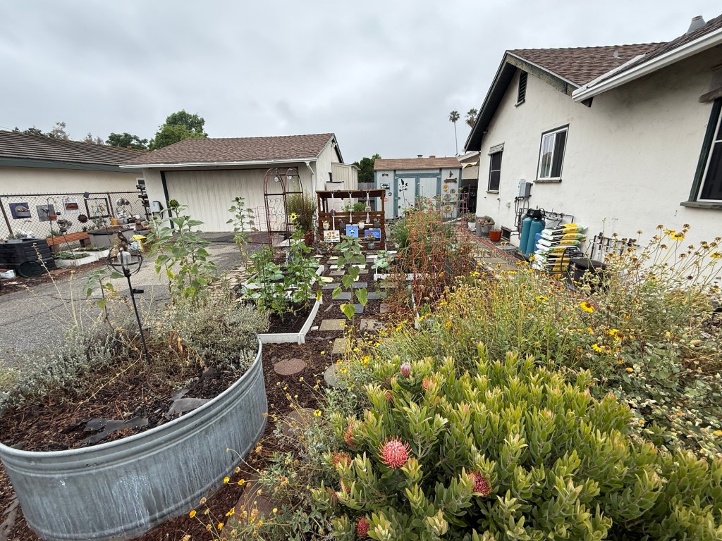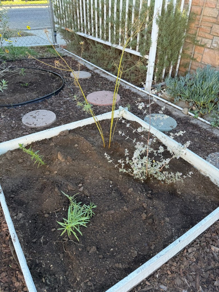 There were some heartbreaks with this garden design change. I lost my protea plant which was large and did not enjoy the replanting process and did not live. I also lost a few native plants but as they are moderately priced and accessible, they could be replaced. And no matter how often I measured the space, I still did not have much space between the boxes which was suppose to have 2 feet of walking space in the median to have that garden stroll feel.