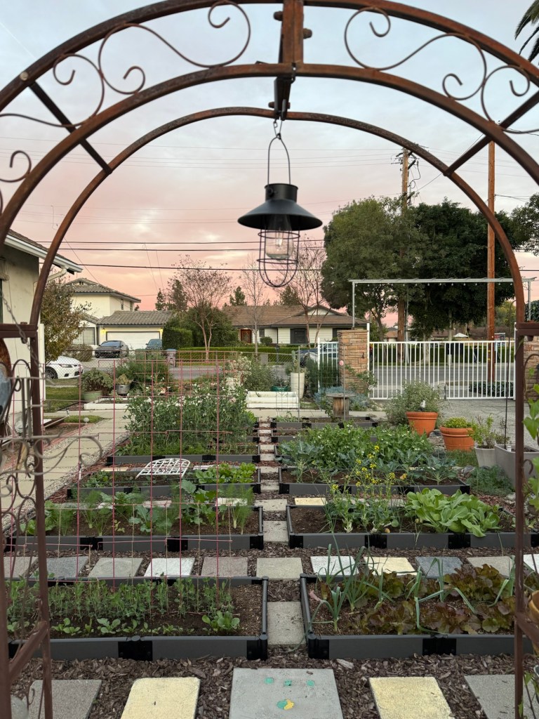 I went from approximately 80 square feet to 144 square feet of planting space. Before I had 4 by 4 feet squares and 2 x 4 feet squares. Throughout the years, I found myself enjoying the plantings at the 2 x 4 feet squares for their compactness and the less need for my arms to overstretch. My new boxes are 2 x 6 feet squares and the added length allows for placement of wider trellises and longer planting rows.